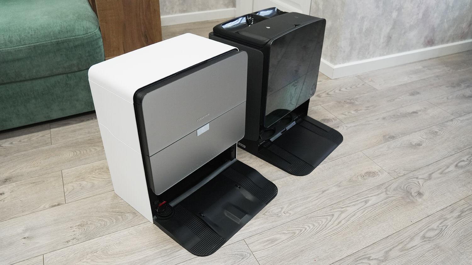 Kalbant apie stoteles, jos taip pat labai panašios, tačiau su nedideliais skirtumais. „Roborock Saros 10R“ stotelė yra blizgi, todėl ant jos matysis visos dulkės ir pirštų atspaudai. „S9 MaxV Ultra“ stotelės danga, mano nuomone, yra praktiškesnė.