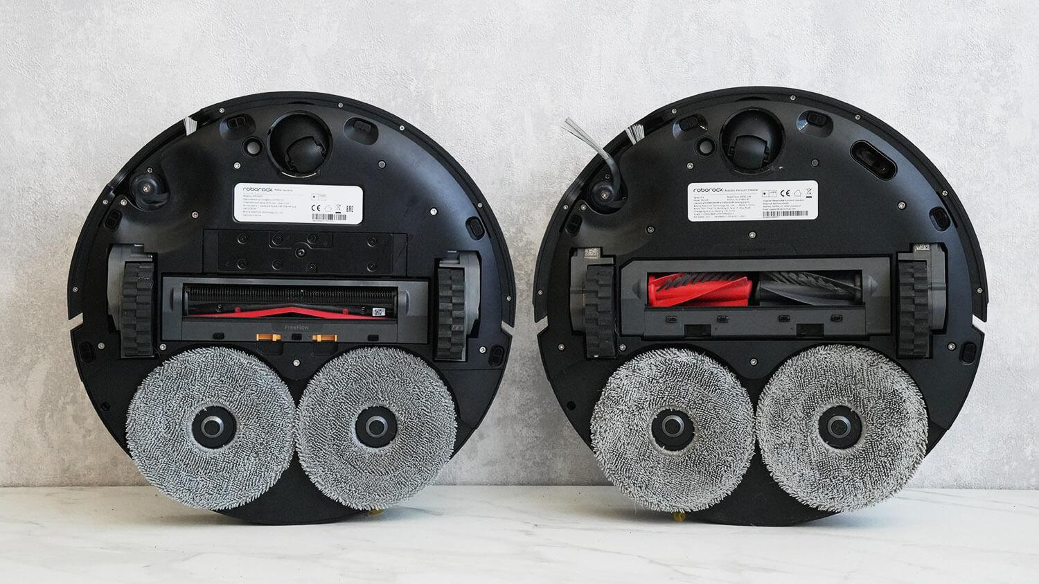 Robotai taip pat praktiškai identiški apačioje, tačiau yra keletas skirtumų. Pirma, „Roborock Saros 10R“ turi papildomą optinį jutiklį, skirtą laidams ant grindų aptikti. Jis yra apačioje, tarp apsaugos nuo kritimo jutiklių.