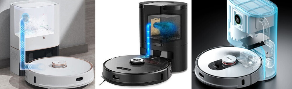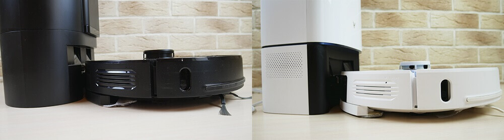 Kita vertus, „Viomi“, „Proscenic“ ir „Roidmi“ atliekos iškraunamos iš galo. Roboto galinė dalis prie stoties pritvirtinta kombinuotu konteineriu, kuriame yra speciali atliekų iškrovimo uždanga.