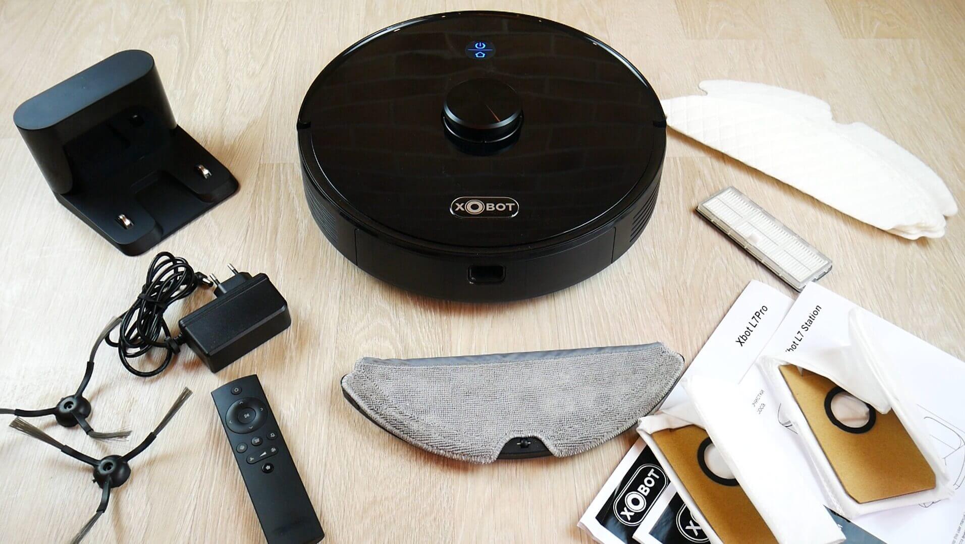„Xbot“ komplektuojamas su pagrindu, dviem atsarginiais šoniniais šepečiais, nuotolinio valdymo pultu ir atsarginiu HEPA filtru. Dėl pridedamų priedų nusiskundimų nėra.