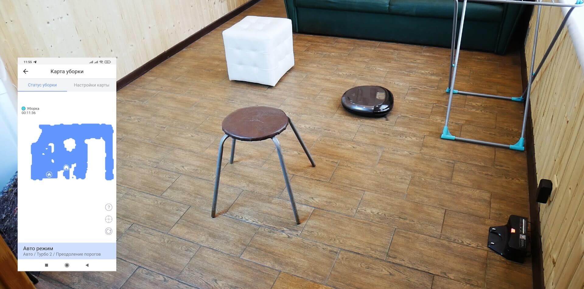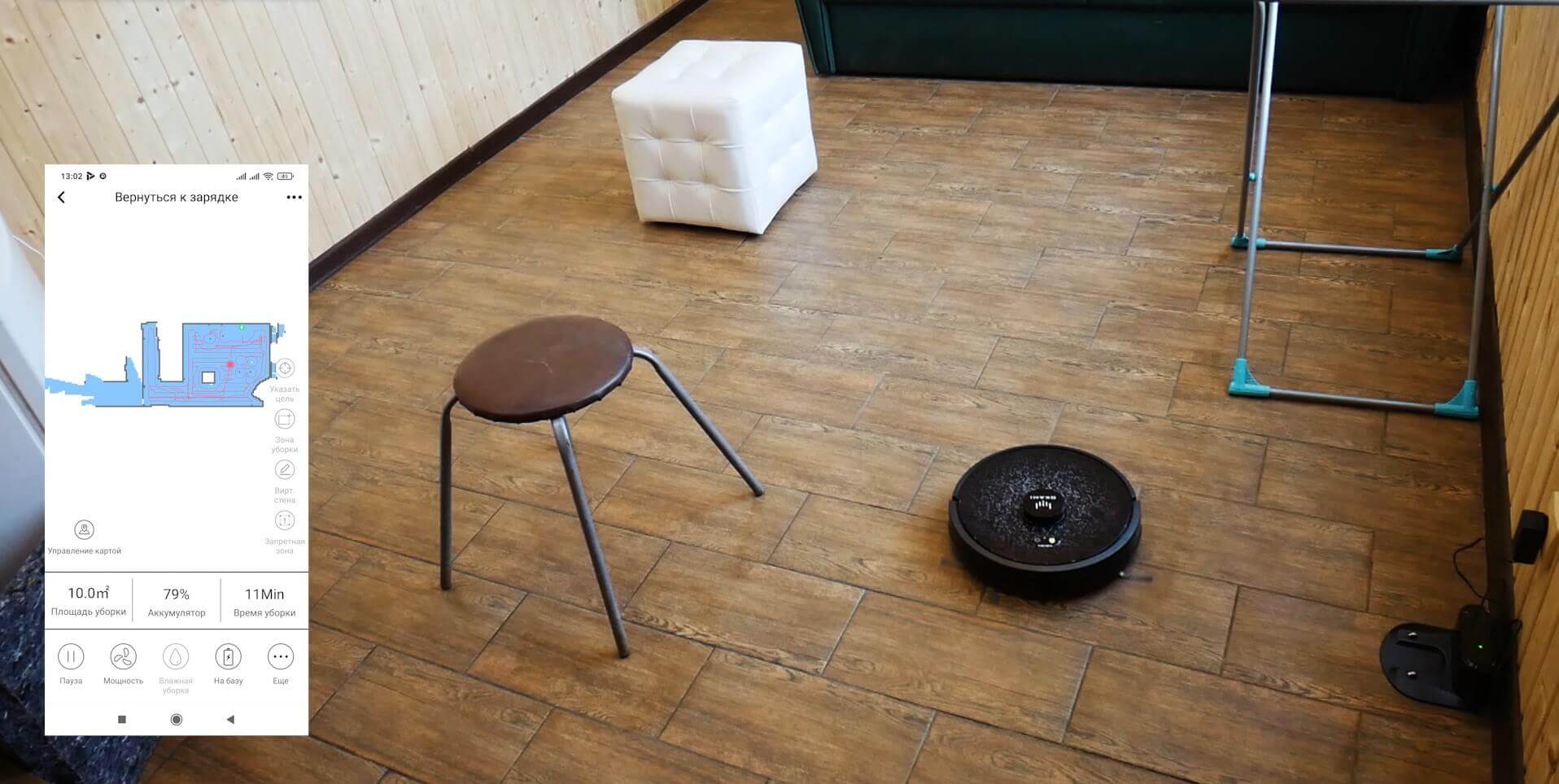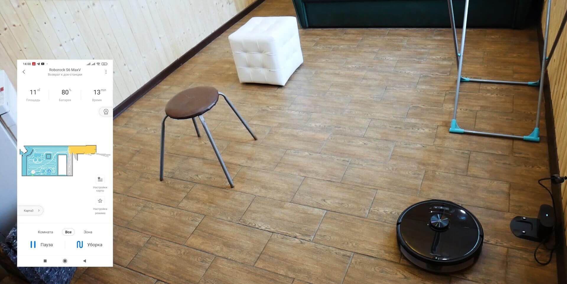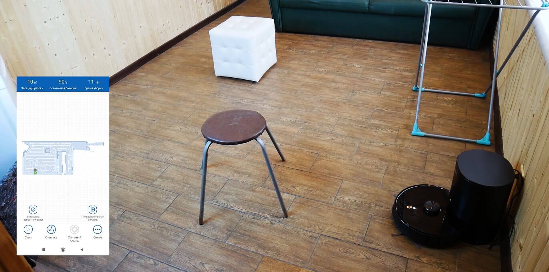 „Roborock S6 MaxV“ pavyko ištrūkti iš džiovyklės kojų sukurtų spąstų; kamera netgi aptiko jas kaip kliūtį. Jis apvalė visą prieinamą plotą, pirmiausia palei perimetrą, o paskui vingiuotu raštu. Jis kruopščiai išvalė aplink dviejų kėdžių kojas, lengvai jas braukdamas, taip pat išvalė tamsią vietą už sofos. Žemėlapis buvo tikslus, išskyrus plotą aplink veidrodį, tačiau šis netikslumas neturėjo įtakos valymo rezultatams; robotas apvalė visą prieinamą plotą, įskaitant plotą aplink veidrodį. 11 kvadratinių metrų ploto valymas užtruko 13 minučių. Atsižvelgiant į kliūtis, tai geras rezultatas.