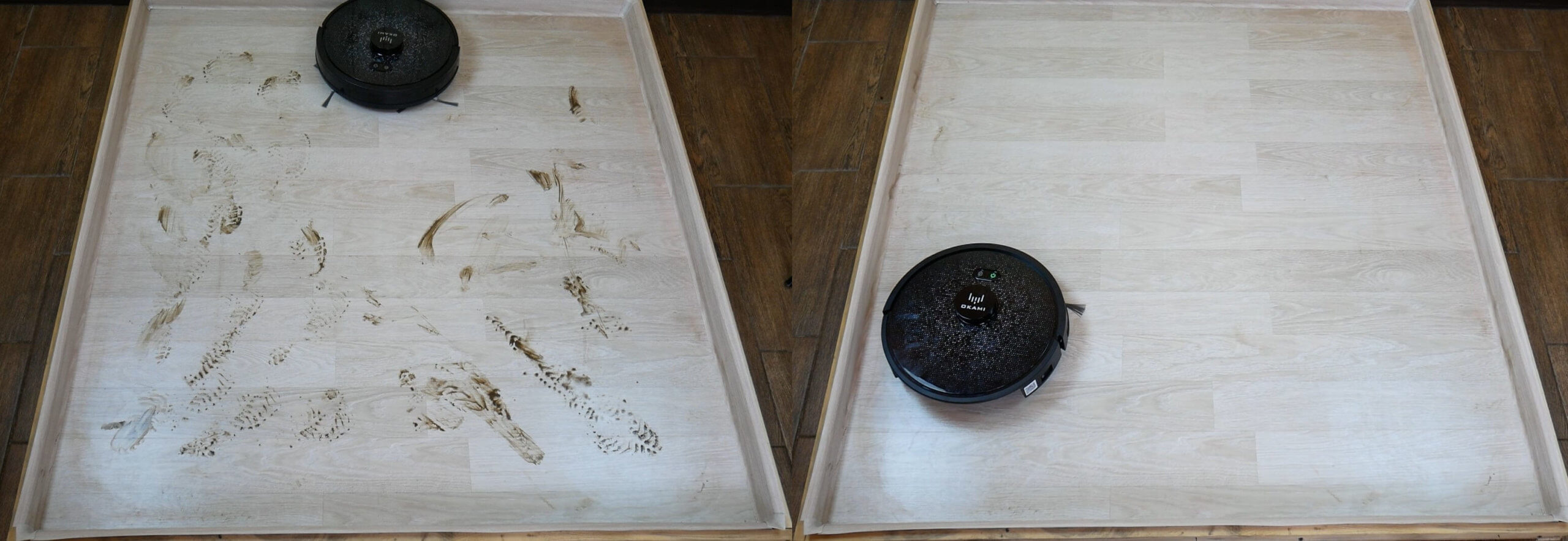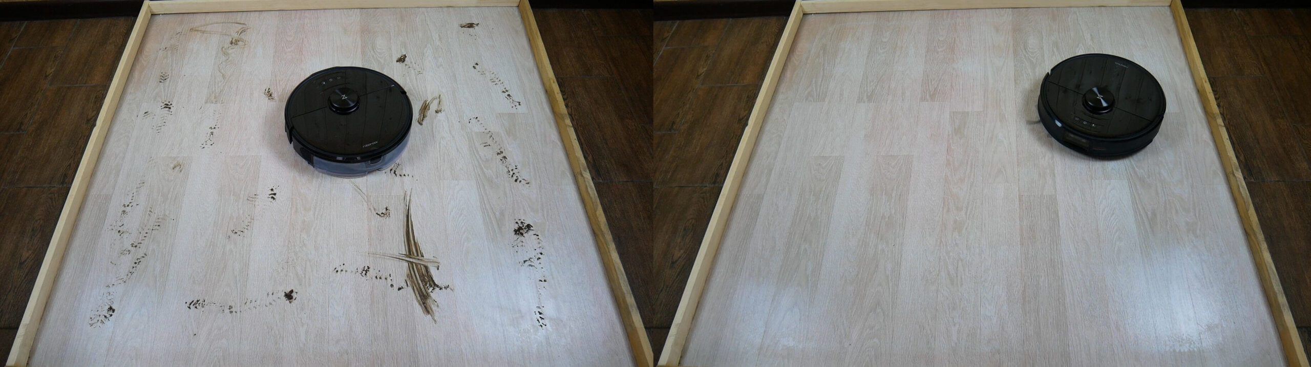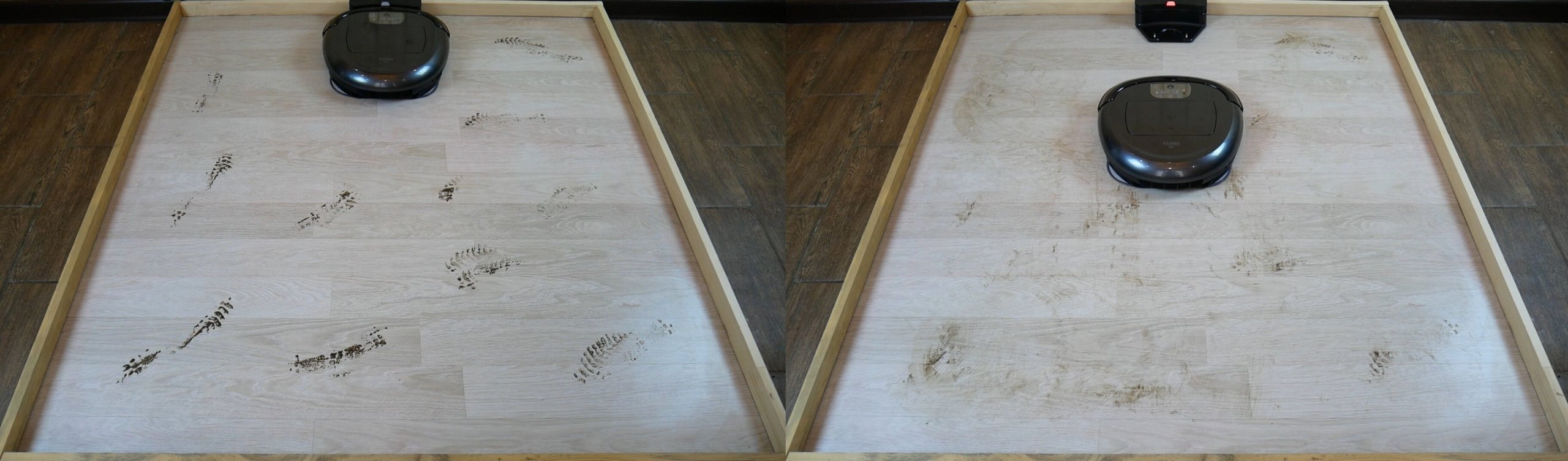 Batų purvu nudažėme laminato stovą, kad pamatytume, kaip robotai susidoroja su sunkiai įveikiamomis dėmėmis.