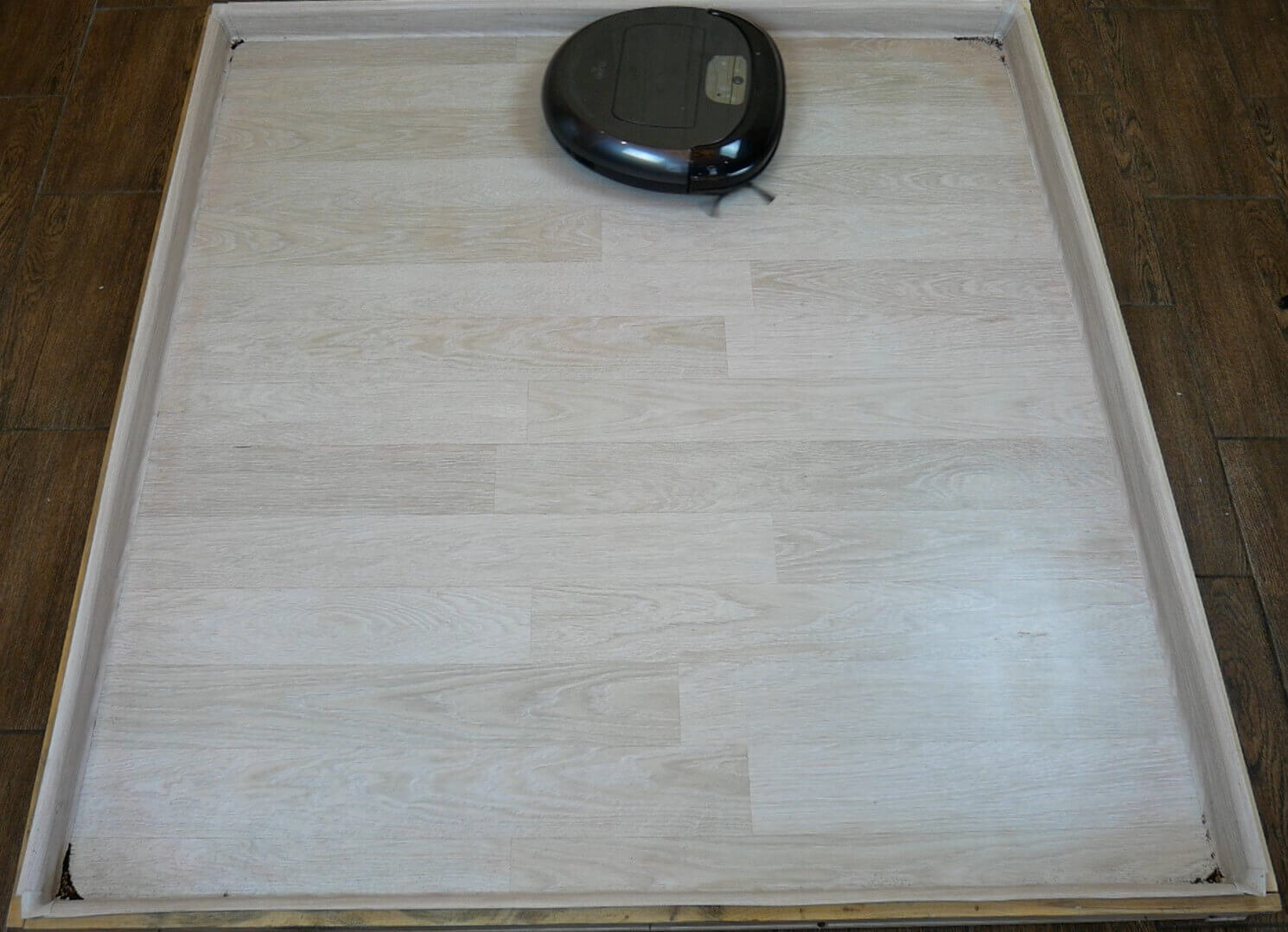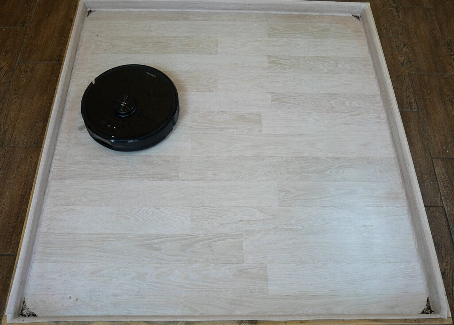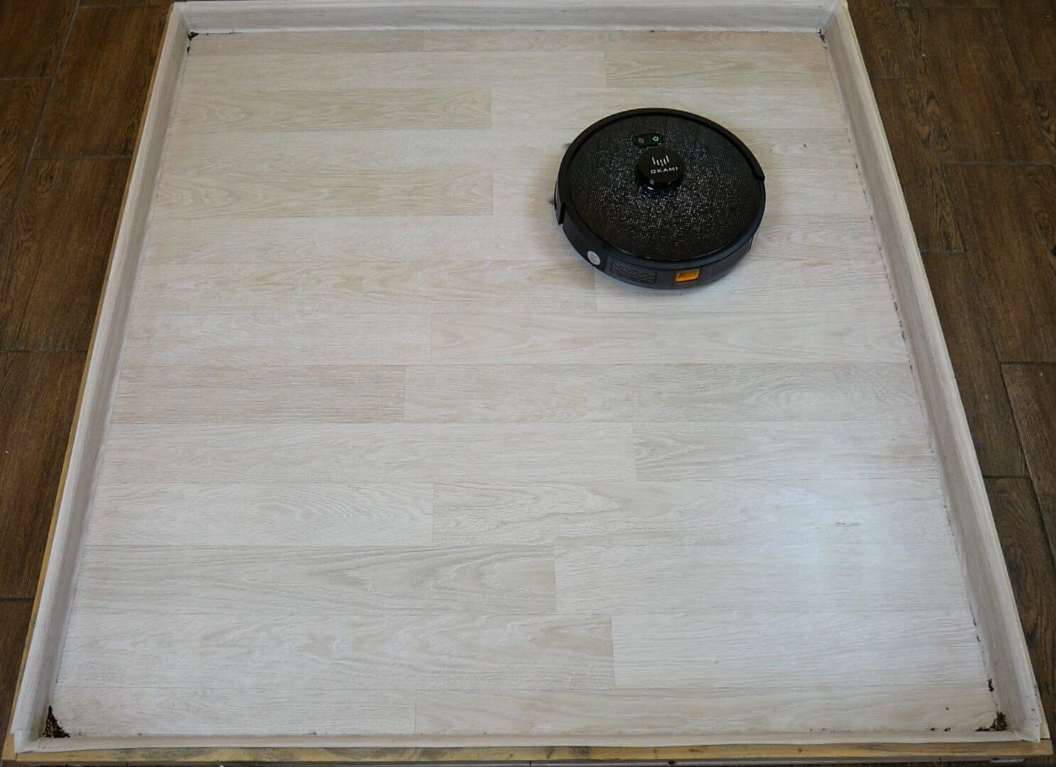 Batų purvu nudažėme laminato stovą, kad pamatytume, kaip robotai susidoroja su sunkiai įveikiamomis dėmėmis.