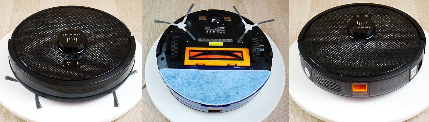 Yra du šoniniai šepečiai – trišakis ir šeriuotas. Papildomą apsaugą nuo plaukų susivėlimo suteikia šoniniai šepečiai. Centrinis šepetys yra nuimamas, šerelių formos. Dulkių surinktuvo talpa yra 600 ml, ją galima pakeisti vandens baku, kuriame telpa 300 ml vandens ir 60 ml sausų šiukšlių. Kitaip tariant, šis modelis turi atskirus sauso ir šlapio valymo režimus, tačiau šlapio valymo režimu robotas gali sušluoti smulkias šiukšles į mažą skyrių. Tačiau šiuo režimu jis negali siurbti, nes variklis yra atskiroje dulkių surinkimo dėžėje. Apačioje sumontuoti trys apsaugos nuo kritimo jutikliai. „Okami“ korpuso aukštis yra 10 cm. Vidutinė kaina – 400 eurų.