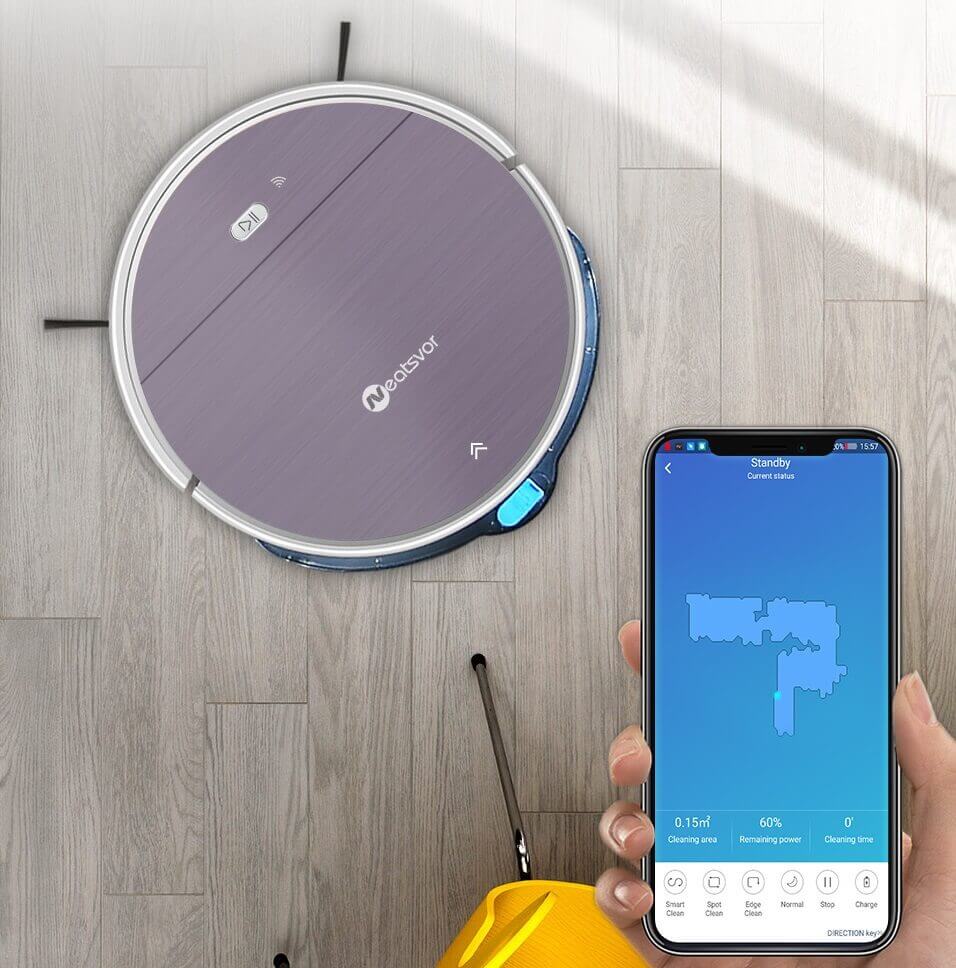 NEATSVOR V390 er en kinesiskprodusert robotstøvsuger designet for tørr- og våtrengjøring av alle typer gulv. Den er egnet for glatte gulv (laminat, parkett, fliser, keramikk, linoleum) og tepper med kort lugg. Designet ligner på sin større søsken. Neatsvor X500 og en dobbel DEXP MMB-300For bare 100 dollar tilbyr denne modellen anstendige spesifikasjoner og funksjonalitet. I denne anmeldelsen skal vi utforske alle funksjonene og gi en detaljert beskrivelse av NEATSVOR V390.