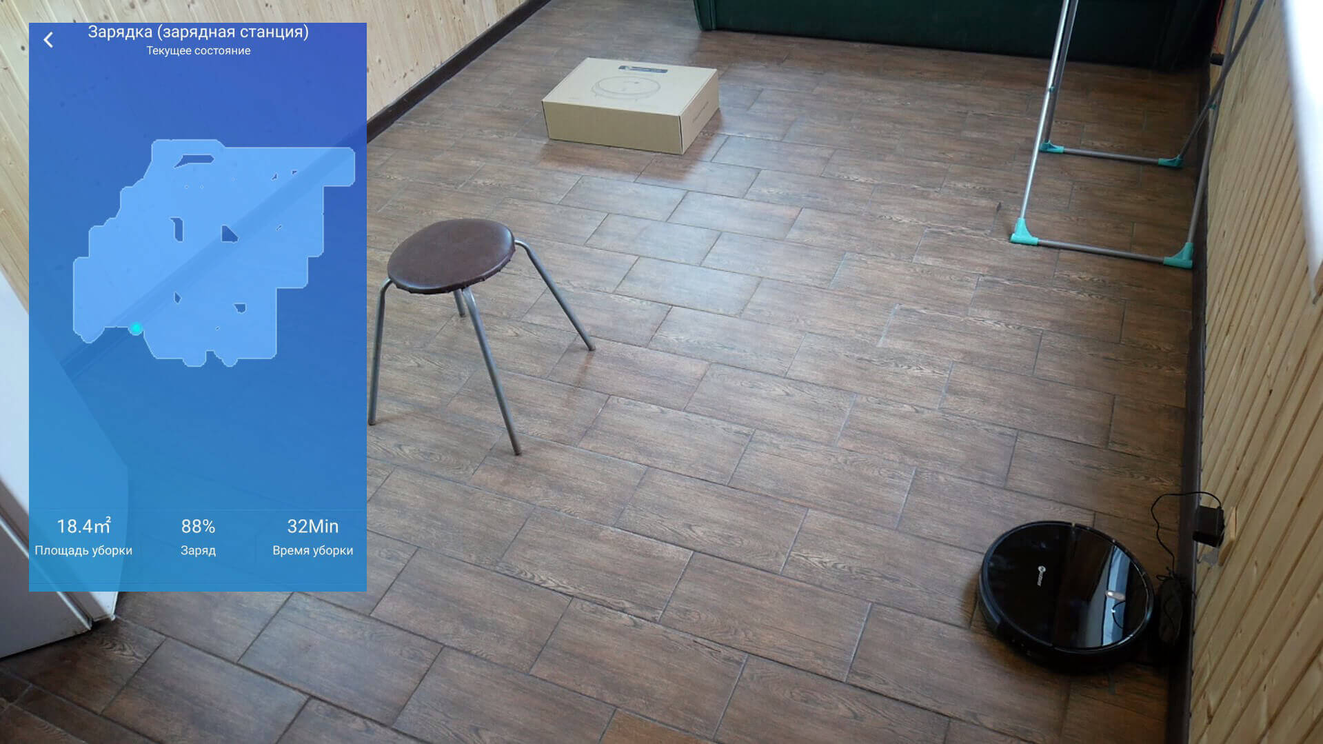 La oss gå videre til testene. Først skal vi sjekke Neatsvor X520s navigasjon i et enkelt rom med hindringer i automatisk rengjøringsmodus. Robotstøvsugeren beveger seg gjennom hele det tilgjengelige området i et serpentinmønster. Kontakten med gjenstander er grov; den flyttet en stol og en eske under rengjøringen. Den satte seg ikke fast på tørketrommelen. Etter å ha kjørt gjennom hele det tilgjengelige området, byttet Neatsvor X520 til perimeterrengjøring, og kjørte tre sirkler uten å returnere til hjemmebasen. Den endte opp med å rengjøre på denne måten i over 30 minutter, hvoretter det ble besluttet å avslutte testen. Som du kan se, tegnet kartet stadig på nytt. Så denne modellens navigasjon under utfordrende forhold inspirerte ikke tillit. Men i det minste da den ble tvunget til å returnere, fant roboten hjemmebasen sin uten problemer og returnerte dit, noe som i det minste er bra.