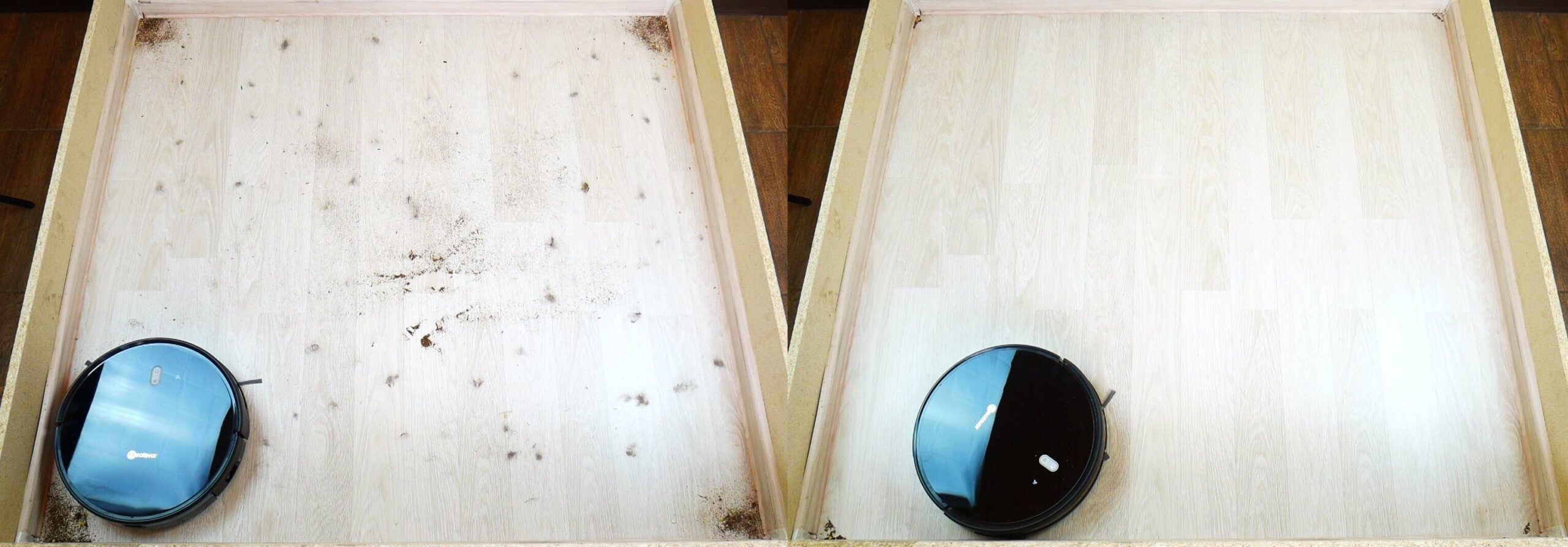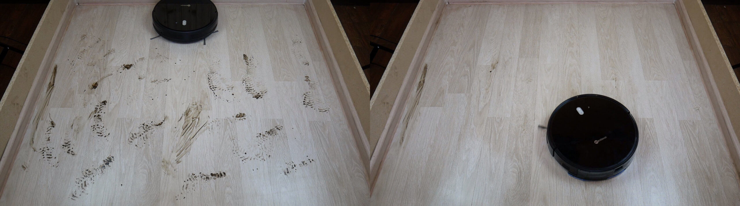 Rengjøringsytelsen er ikke særlig god. Det er fortsatt noe smuss igjen på stativet, inkludert langs sokkellisten. Gitt stativets opprinnelige tilstand er imidlertid robotens rengjøringsytelse gjennomsnittlig.