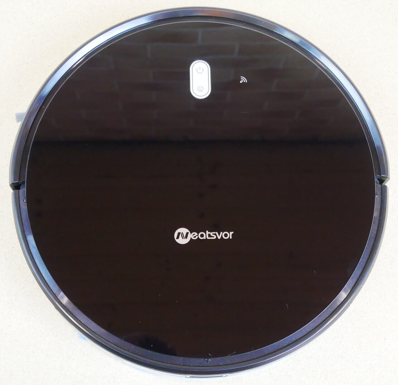 La oss nå ta en titt på selve robotstøvsugeren. Neatsvor X520, i likhet med sin eldre bror X600 Den er svart med en blank overflate. På toppen finner du firmalogoen, to kontrollknapper (Start/Pause og Return to Charge) og en Wi-Fi-tilkoblingsindikator. En myk mekanisk støtfanger er plassert på forsiden.