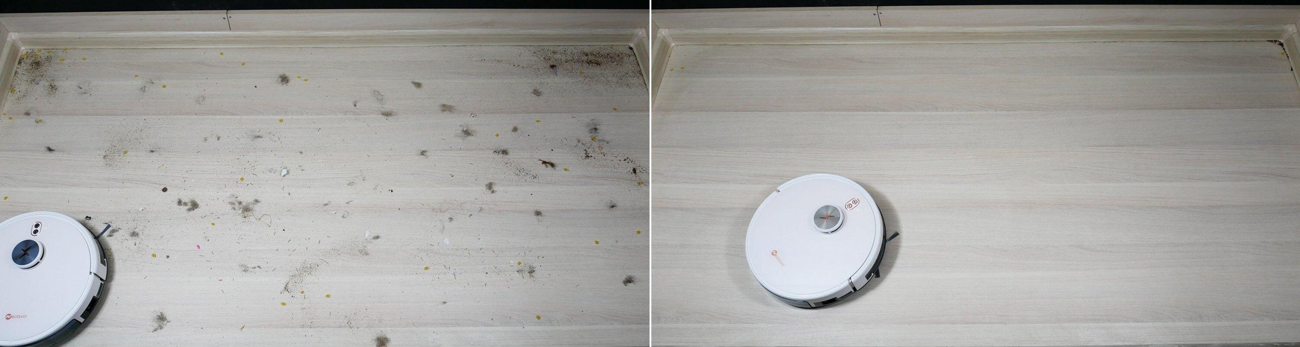 Rengjøringsytelsen var utmerket; roboten plukket opp alt rusk fra laminatgulvet, og etterlot bare en liten mengde i hjørnene, der runde robotstøvsugere ikke kan nå. Dyrehår og pels var viklet rundt midtbørsten, selv om det så ut til at sidebørstene ble hardest rammet. Mesteparten av rusket ble samlet opp i støvbeholderen. Testen ble bestått.