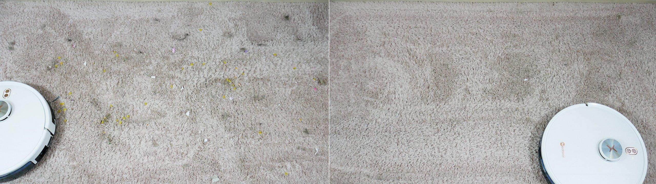 Tepperensingsytelsen var over gjennomsnittet. Noe rusk ble fanget i haugen, men mesteparten ble likevel plukket opp. Så roboten er egnet for rengjøring i hjemmet og rengjøring av tepper med kort og mellomlang luv.