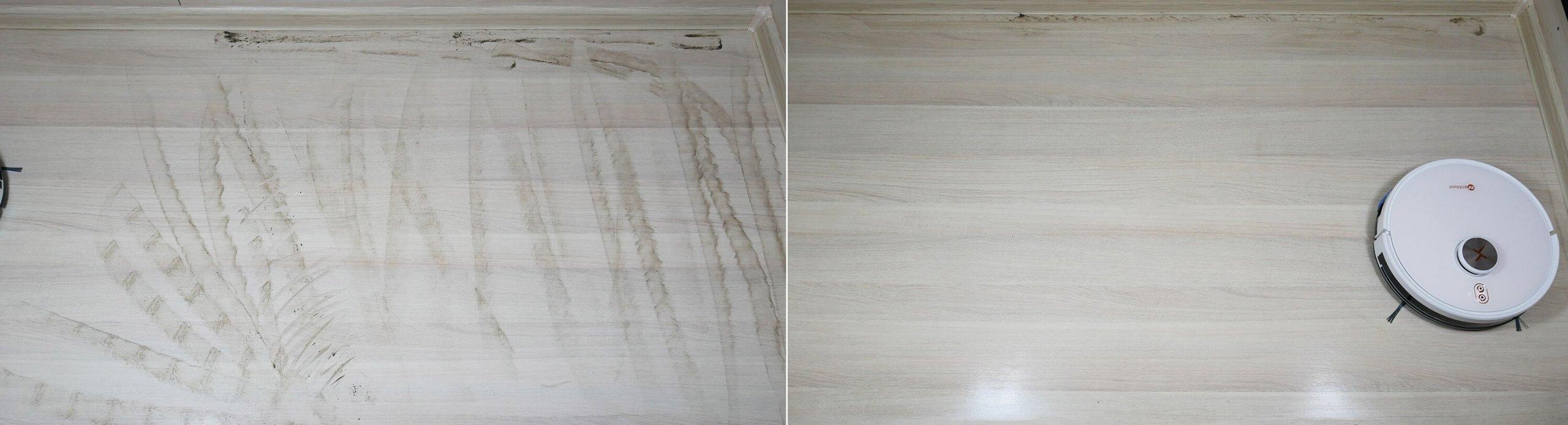 Rengjøringseffekten for lette flekker er generelt god. Robotstøvsugeren klarte å fjerne inntørket smuss uten å etterlate striper. Dette er et pluss. Det eneste gjenværende området er en smal sone langs gulvlisten, som er en blindsone for nesten alle eksisterende robotstøvsugere.