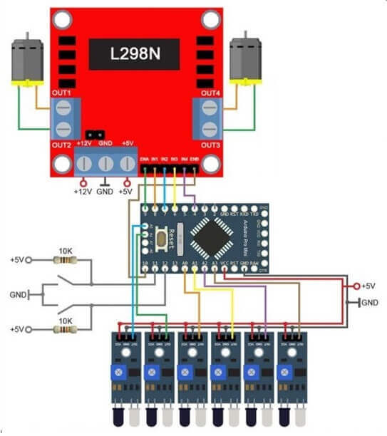 Le système de navigation est composé de six capteurs d'obstacles infrarouges. Si aucun capteur n'est déclenché, deux capteurs de contact (interrupteurs de fin de course) prennent le relais. Le système de commande du moteur utilise le même circuit intégré L298N. Pour l'assembler, vous aurez besoin de :