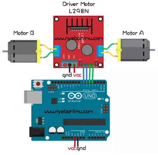 Pour réguler la vitesse, un signal PWM est appliqué à la broche ENA ou ENB. Pour définir le sens de rotation, des signaux opposés sont appliqués aux broches IN1 et IN2 pour un moteur, et aux broches IN3 et IN4 pour l'autre. Si IN1 est à l'état logique 1 et IN2 à l'état logique 0, le moteur tourne dans un sens. Pour inverser le sens de rotation, inversez les 1 et les 0. Le montage doit être réalisé avec une carte Arduino en suivant le schéma ci-dessous (vous pouvez utiliser n'importe quelles broches ; spécifiez-les dans le programme).