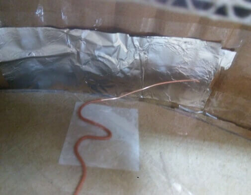 Vous pouvez aussi fabriquer vous-même les butoirs de contact. Il vous faudra un fil fin mais rigide, comme un câble à paires torsadées. Pour cela, créez une pastille de contact à l'intérieur du butoir à l'aide d'une feuille d'aluminium et fixez-y le fil comme indiqué ci-dessous. Lorsque l'aspirateur robot entrera en collision avec un meuble ou un mur, le contact se fera. Ajustez la distance entre le fil et la feuille d'aluminium pour obtenir la sensibilité souhaitée et éviter les fausses alarmes. Appliquez une tension de 5 V à la feuille d'aluminium et connectez le fil à l'entrée de l'Arduino, reliée à la masse par une résistance de quelques kiloohms.