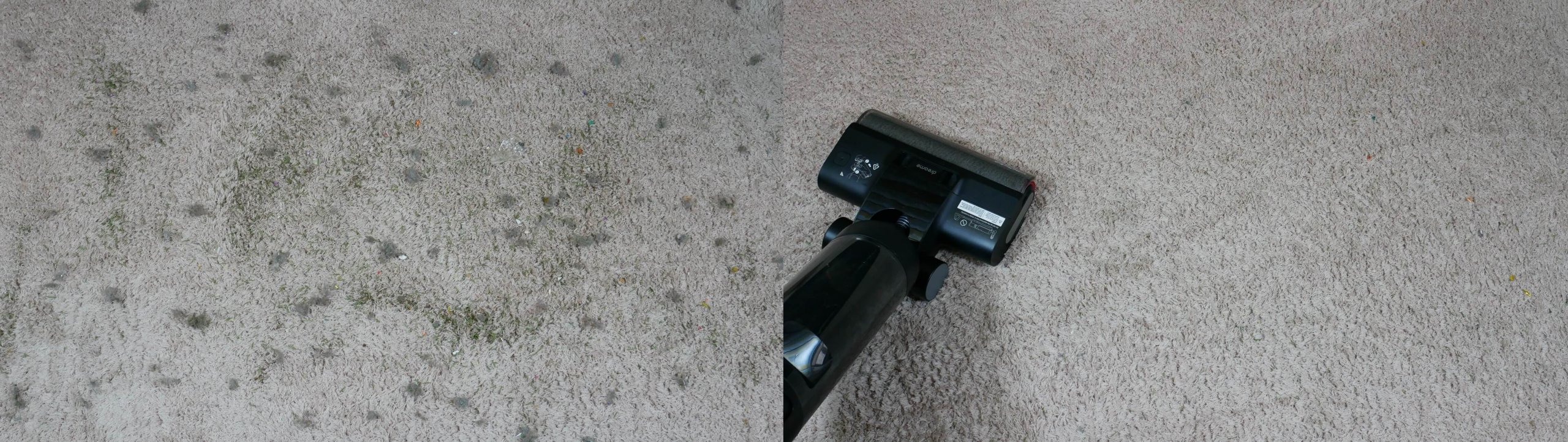 Glede na to, da gre za mokro/suhi sesalnik, ni praktičen za čiščenje preprog. Vendar je to še vedno mogoče, če v rezervoar ne dodate vode ali če uporabite mokri način, ki preprosto posesa ostanke brez nanosa vode. Valj je kljub svoji puhasti teksturi sposoben pobrati živalsko dlako, lase in druge ostanke. Vendar pa lahko ostanki zamašijo sesalno odprtino in blokirajo krtačo, kar se je zgodilo med testiranjem, saj sesalni sistem brez vode ne deluje pravilno. Na splošno priporočam čiščenje preprog z običajnim pokončnim sesalnikom ali pa delo zaupate robotskemu sesalniku ustrezne zasnove in moči.