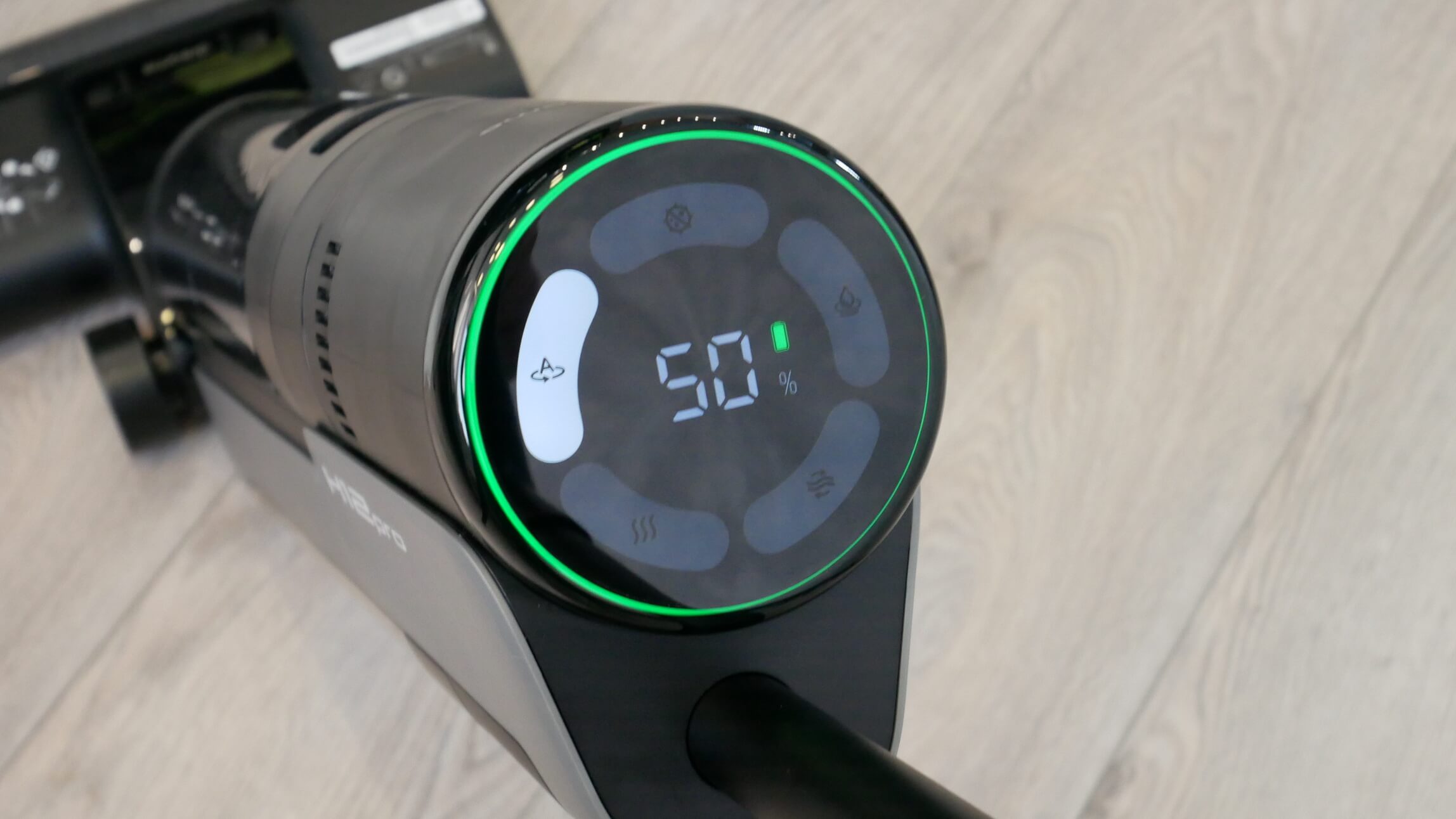 Zaslon je priročno nameščen na vrhu ohišja. Prikazuje napolnjenost baterije, izbrani način delovanja, raven moči in servisna sporočila. Na voljo je pet načinov delovanja: samodejni, ultra način, način sesanja, samočiščenje in sušenje z valjčkom. Vsakega bom na kratko predstavil.