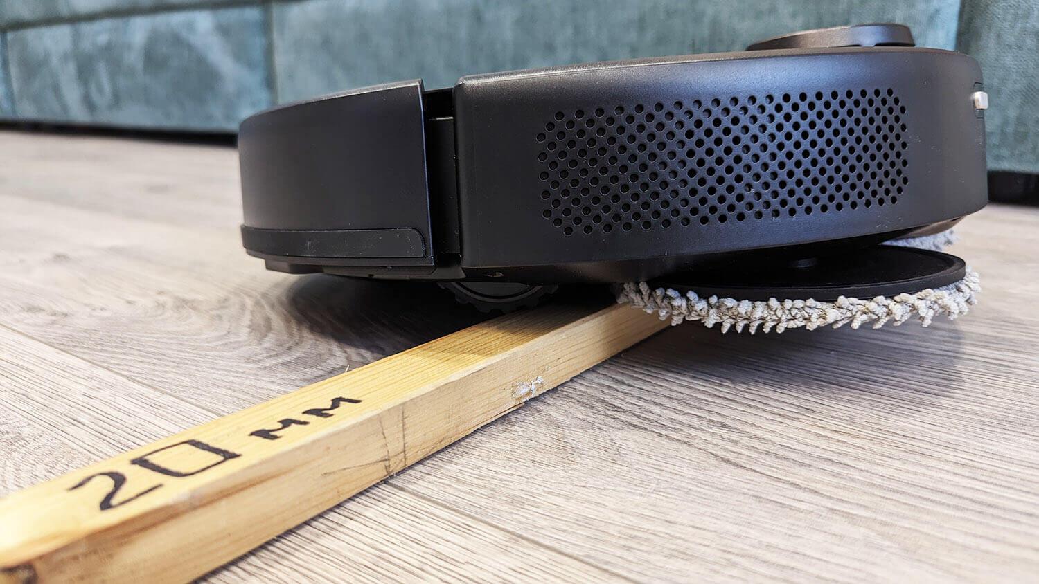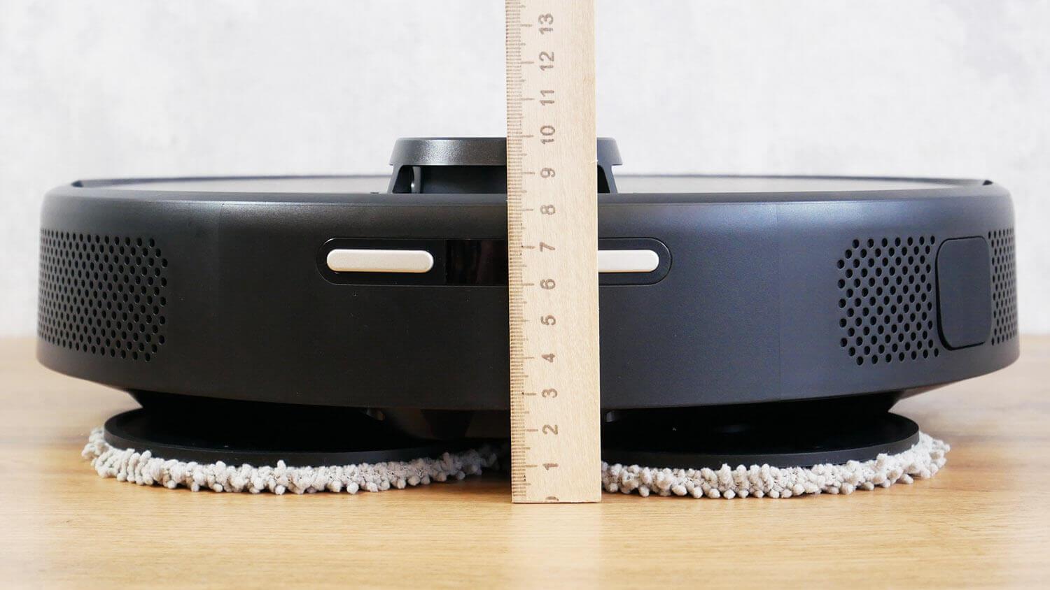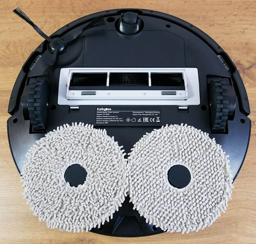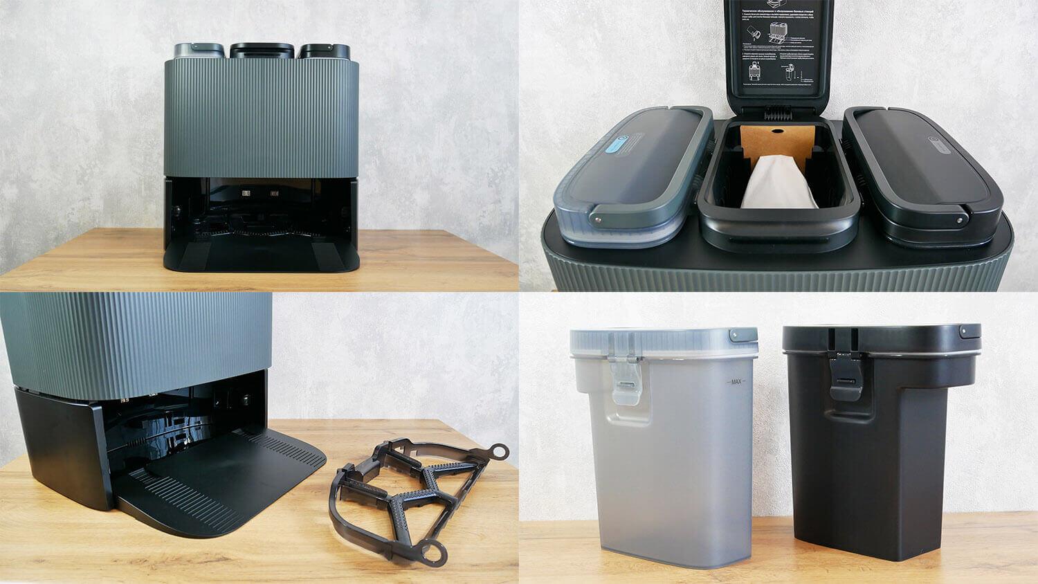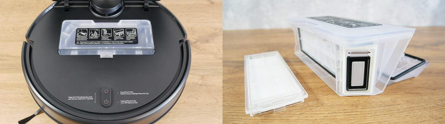 Za navigacijo je odgovoren lidar senzor. Pokrov lidarja ni vzmeten. Zbiralnik prahu se nahaja pod zgornjim pokrovom. Vsebuje 420 ml. Sistem filtracije je dvojni: mrežasti filter in HEPA filter. Rezervoarja za vodo ni. Robčki se navlažijo le na postaji za pranje.