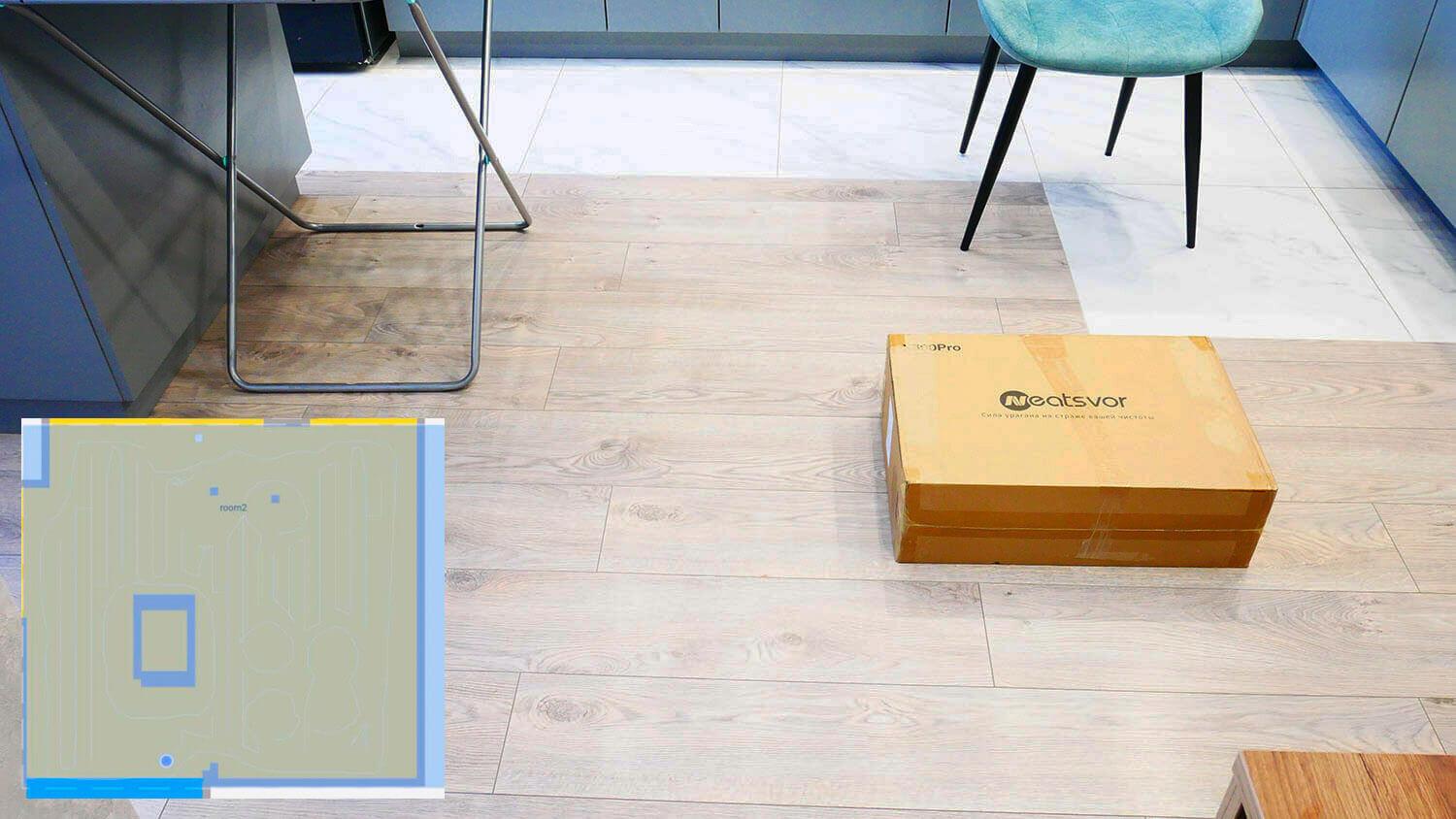 In končno, preidimo k testom. Najprej bomo preizkusili navigacijo KaringBee S7 OMNI v prostoru z ovirami. Robotski sesalnik se najprej premika po obodu prostora, nato pa v vijugastem vzorcu očisti celotno dostopno območje. Noge sušilnika niso povzročale težav. Robot je ločeno pometel tudi okoli nog škatle in stola, nato pa se vrnil na postajo. Test je bil uspešen.