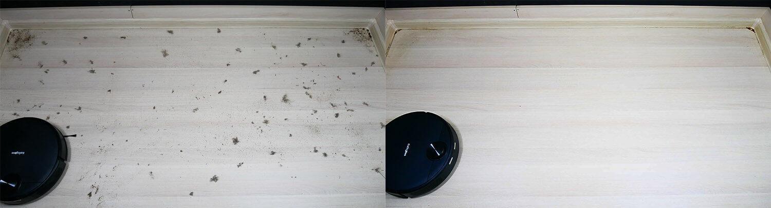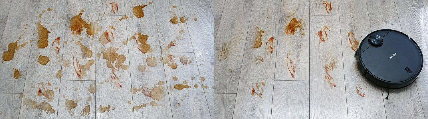 KaringBee S7 OMNI dobro odstranjuje rahlo umazanijo in nesnago. Umazanijo odstrani brez puščanja sledi ali sledi. Krpe dobro vpijajo umazanijo. Edina težava je, da je ozek del tal vzdolž podnožja ostal neopranega, ker krpe ne segajo do robov. To je težava večine testiranih robotskih sesalnikov.