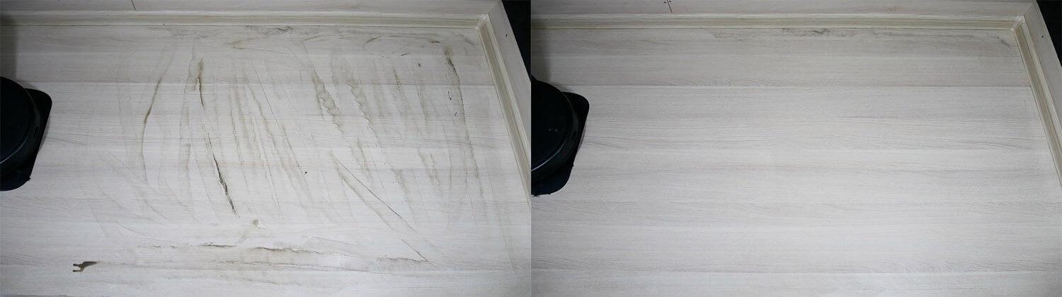 Kakovost zbiranja različnih vrst odpadkov na laminatnih tleh je dobra. V kotih ostane le majhna količina odpadkov, kjer okrogli robotski sesalniki ne morejo pomesti. Vsi odpadki se zberejo v posodi za prah. Osrednja krtača je pobrala nekaj dlake in dlake, vendar je večina odpadkov še vedno v posodi za prah.