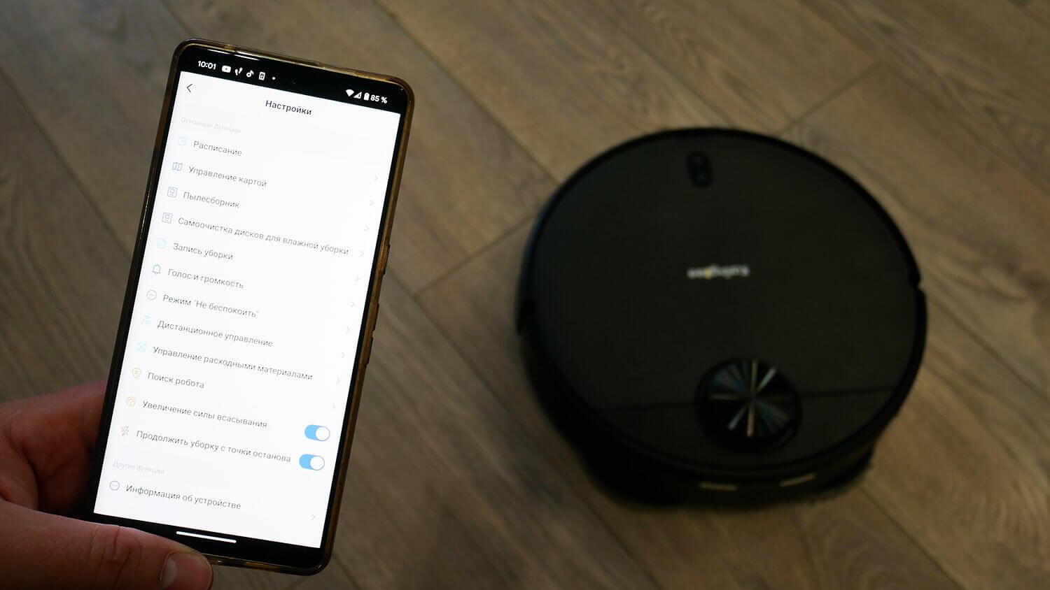 In tukaj osebno pogrešam nekaj funkcij. Prvič, robotskega sesalnika ne morete uporabljati samo za suho čiščenje. Razen če v rezervoar dodate vodo ali ročno odstranite držala čistilnih blazinic iz robota. V vseh drugih primerih se funkcija izpiranja čistilnih blazinic vedno aktivira ob zagonu in je ni mogoče onemogočiti v aplikaciji. To je neprijetno. Drugič, nastavitev pogostosti izpiranja čistilnih blazinic je zelo omejena. Izberete lahko eno od treh možnosti: po 8 kvadratnih metrih čiščenja, po 10 ali po 12. V idealnem primeru bi bilo mogoče robota po vsakem čiščenju vrniti na čistilno postajo, da opere blazinice. Na preprogi ni funkcije dviga čistilnih blazinic, kar je prav tako neprijetno. Poleg tega na čistilni postaji ni mogoče nastaviti vlažnosti blazinic. Ni nobenih nastavitev za količino vode, ki se dovaja med čiščenjem ali ob odhodu iz čistilne postaje.