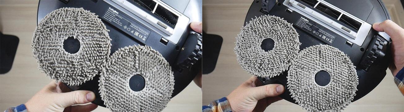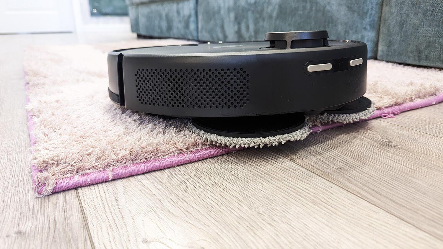 Pri mokrem čiščenju preprog imate dve možnosti za delovanje robota. V načinu mokrega čiščenja omogočite samodejno izogibanje preprogam, kar je bolj logično. Lahko pa tudi onemogočite izogibanje preprogam, kar pomeni, da bo robot s svojimi čistilnimi blazinicami zapeljal na preprogo in tako onemogočil vrteče se diske. To bo neizogibno povzročilo stik mokrih čistilnih blazinic s preprogo, kar ni idealno.