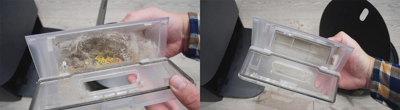 Samočiščenje posode za prah je skoraj popolno. Robotski sesalnik sem uporabljal v prostoru z veliko odpadki. Po čiščenju smo videli, da je posoda za prah polna. Robotski sesalnik smo vrnili na polnilno postajo in videli, da je bila posoda za prah po samočiščenju popolnoma prazna. Samočiščenje je dobro izvedeno.