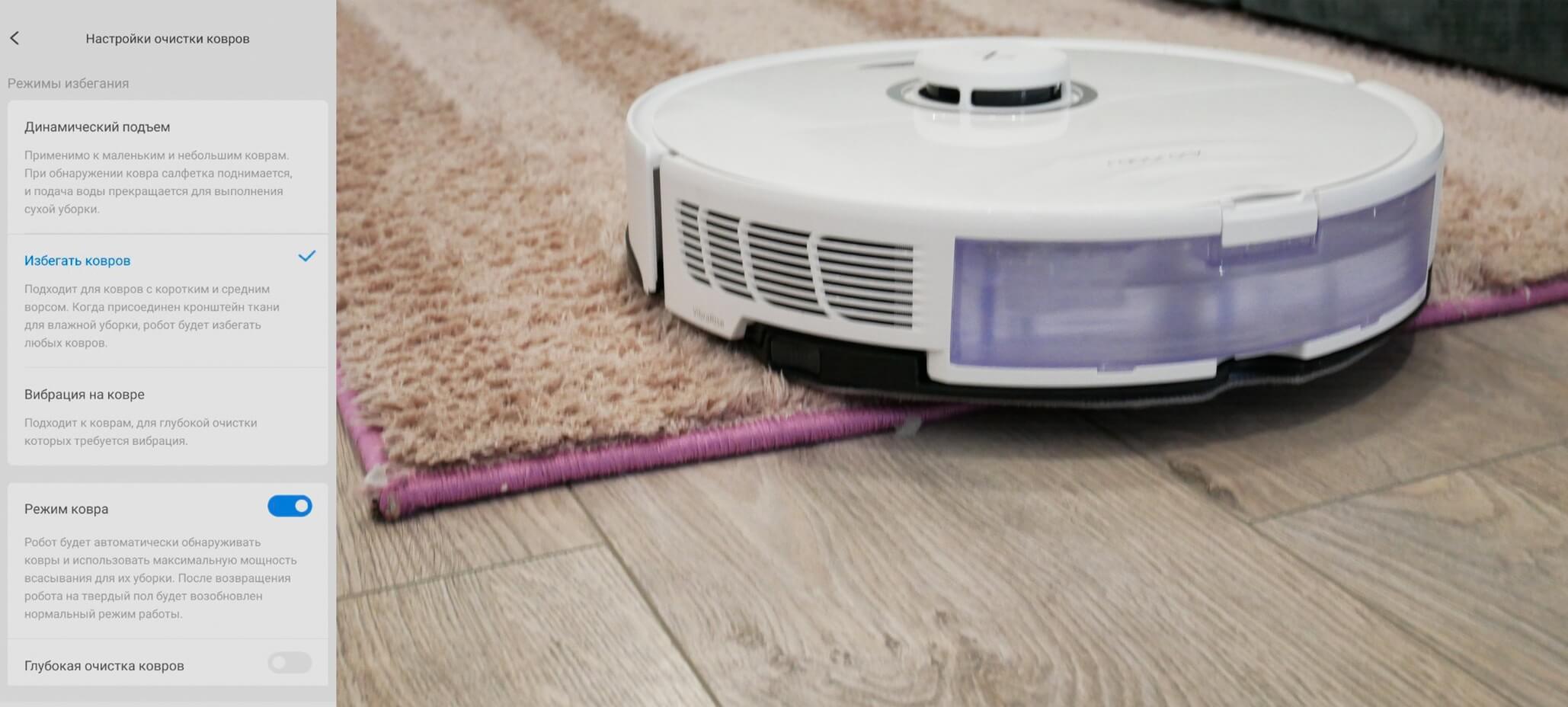 Za mokro čiščenje preprog ima robot tri načine interakcije s preprogami. V načinu mokrega čiščenja se lahko previdno giblje okoli njih ali pa se vozi po njih in pritisne čistilno krpo obnje, če jih želite očistiti z robotom. Najboljša možnost je, da se čistilna krpa samodejno dvigne pri vožnji po preprogah.