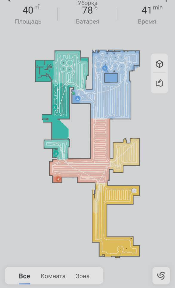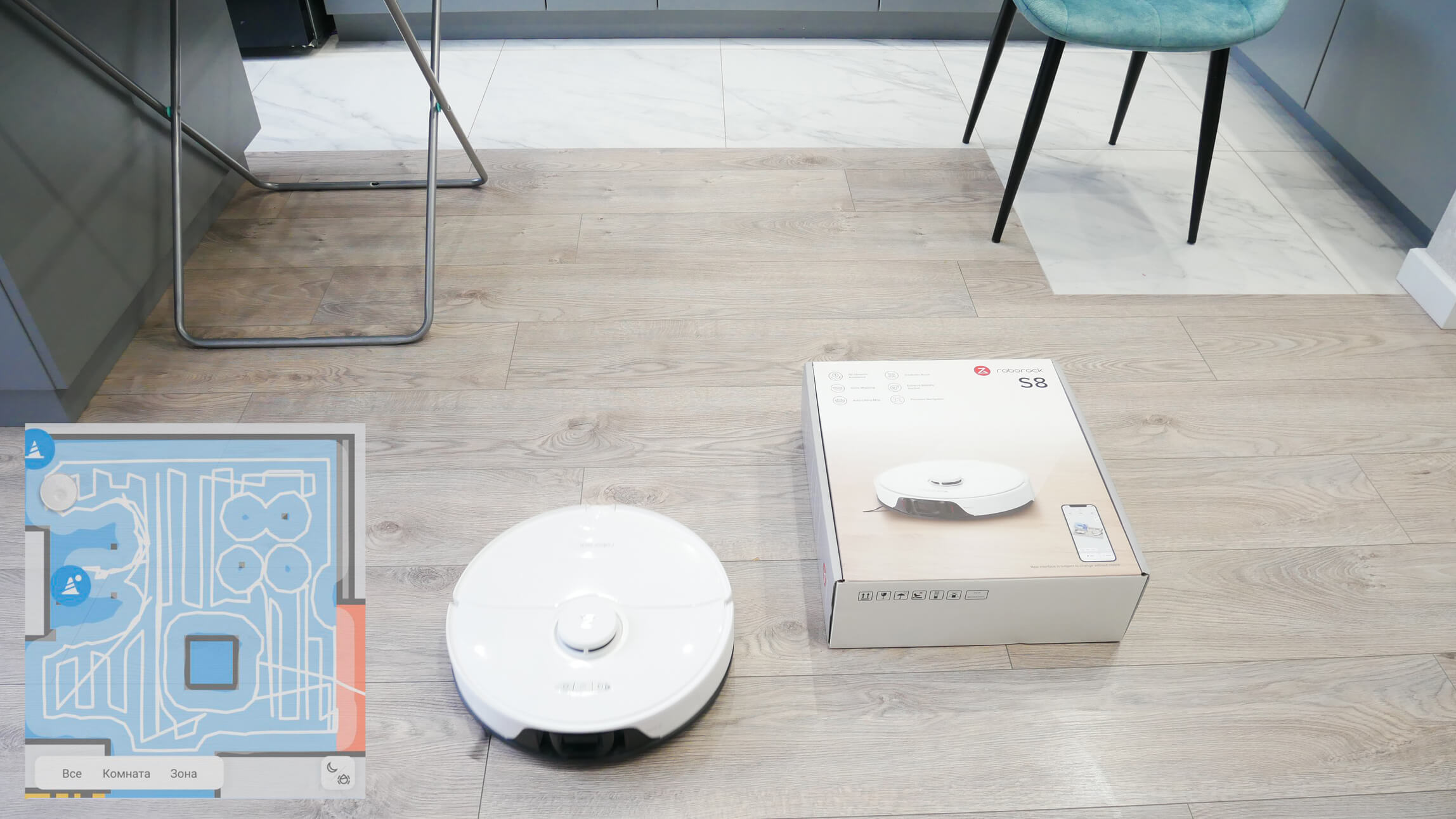 In končno, preidimo k testom! Najprej bomo preizkusili navigacijo Roborocka S8 v prostoru z ovirami. Ko robotski sesalnik vstopi v prostor, najprej obkroži obod, nato pa v vijugastem vzorcu očisti celotno dostopno območje. Prepoznal je noge sušilnega stroja in previdno obšel to past. Robot je obkrožil tudi vse štiri noge stola in škatlo, preden se je vrnil na svoje mesto. Test uspešen!