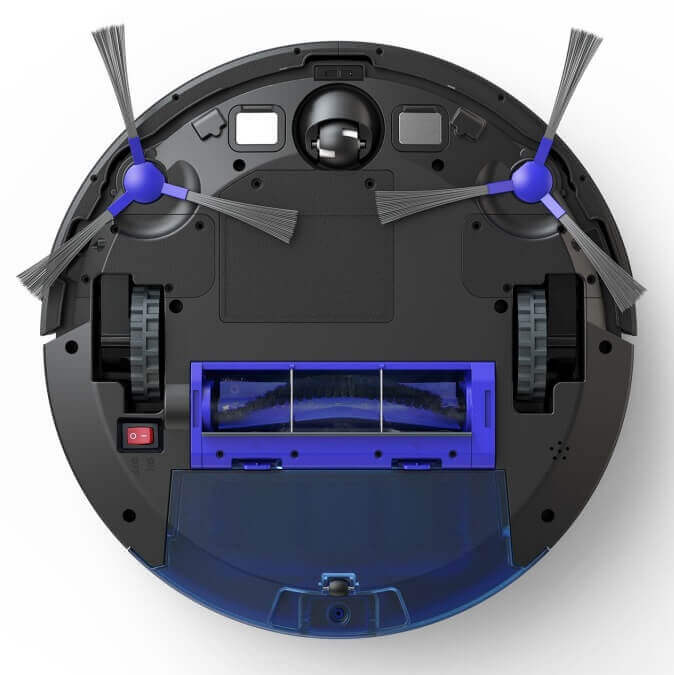 Ở phía đối diện của máy hút bụi robot là hai bánh xe dẫn động ở hai bên, một bánh xe xoay ở phía trước, các điểm tiếp xúc từ tính để tự động sạc trên đế sạc, ngăn chứa pin ở phía dưới và hai chổi quét bên. Xa hơn về phía trung tâm là một chổi quét turbo dạng cánh hoa với lưới bảo vệ và công tắc nguồn chính. Cảm biến chống rơi cũng được gắn ở phía dưới để ngăn ngừa rơi từ các bề mặt cao.